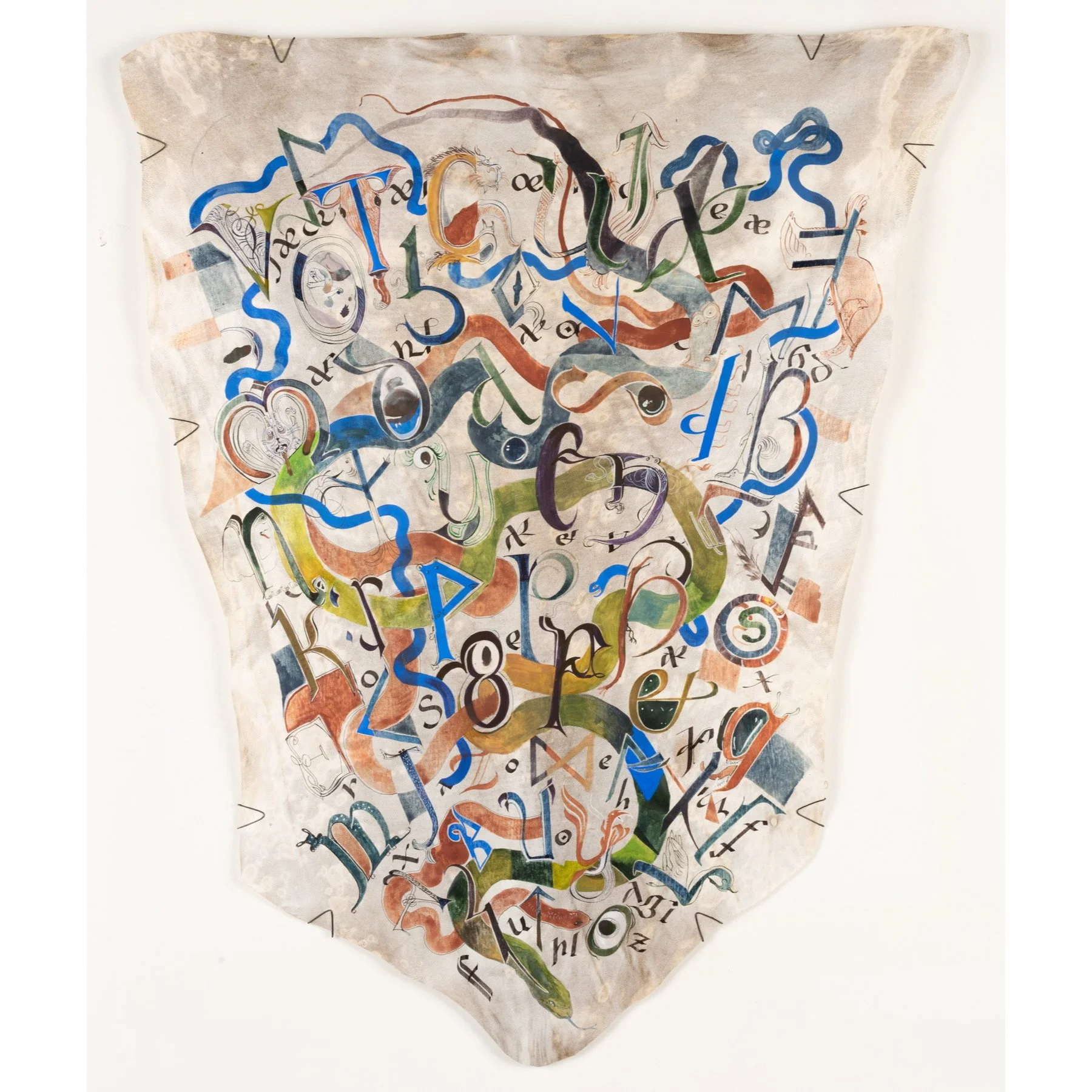 Ink, indigo, watercolor & graphite on a full goat skin parchment