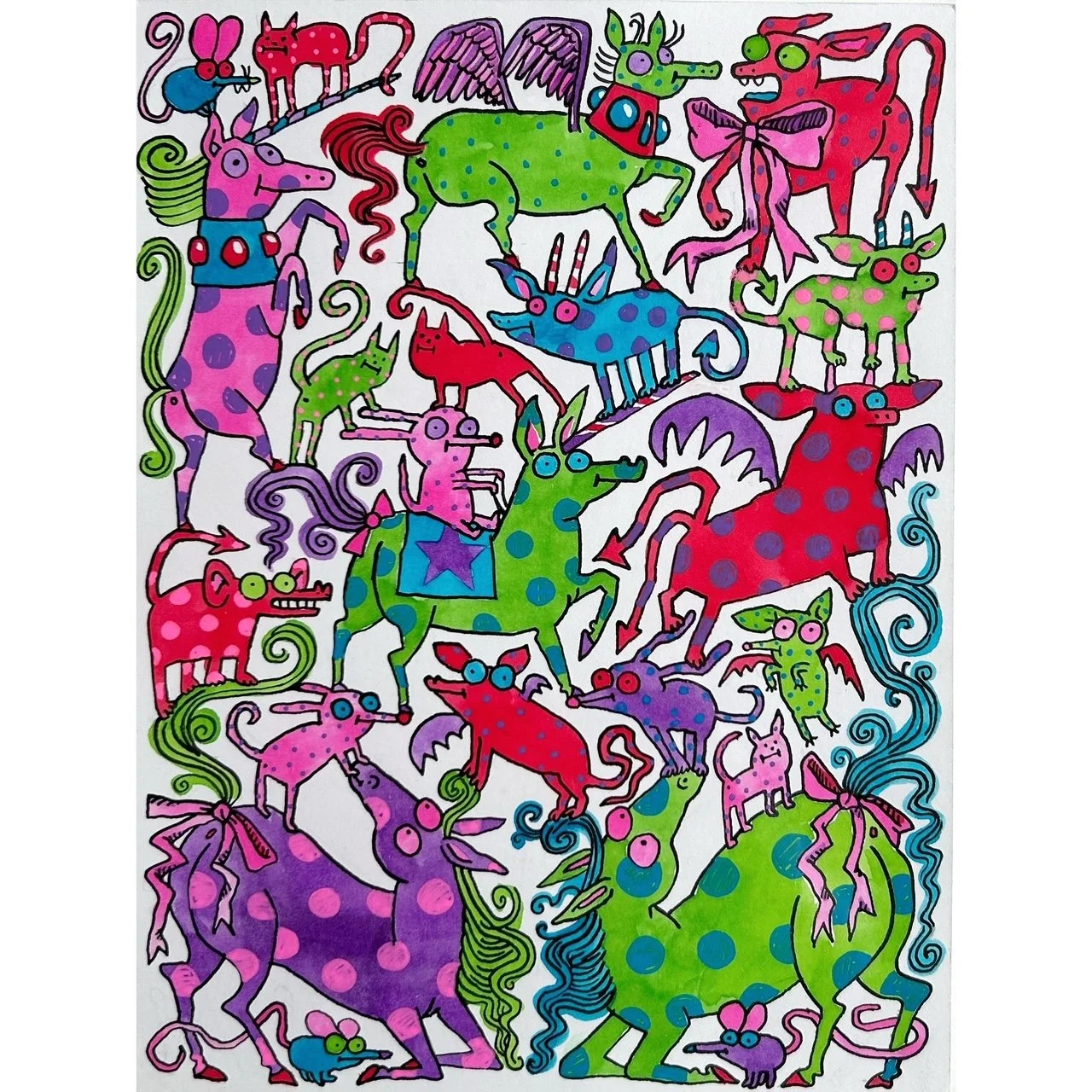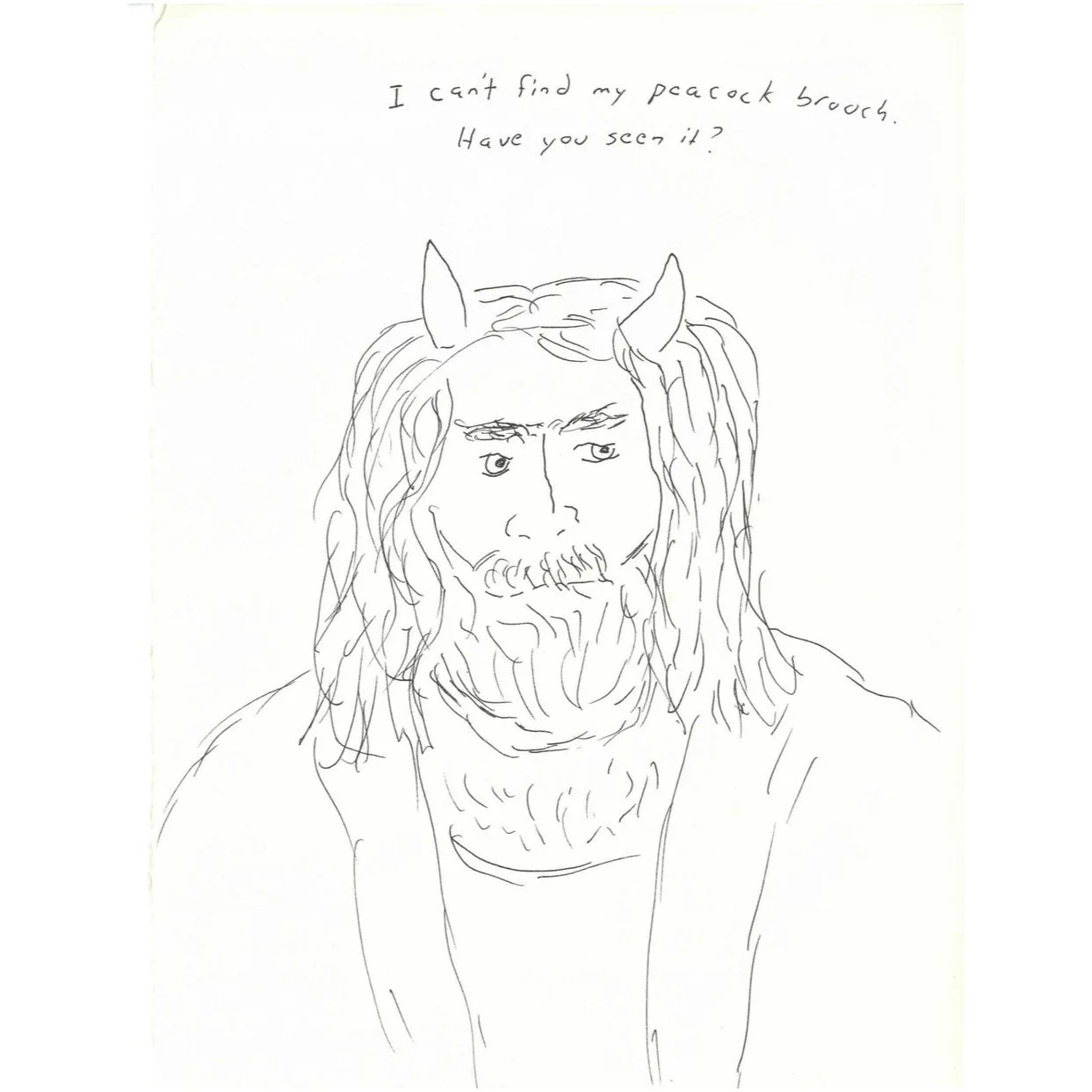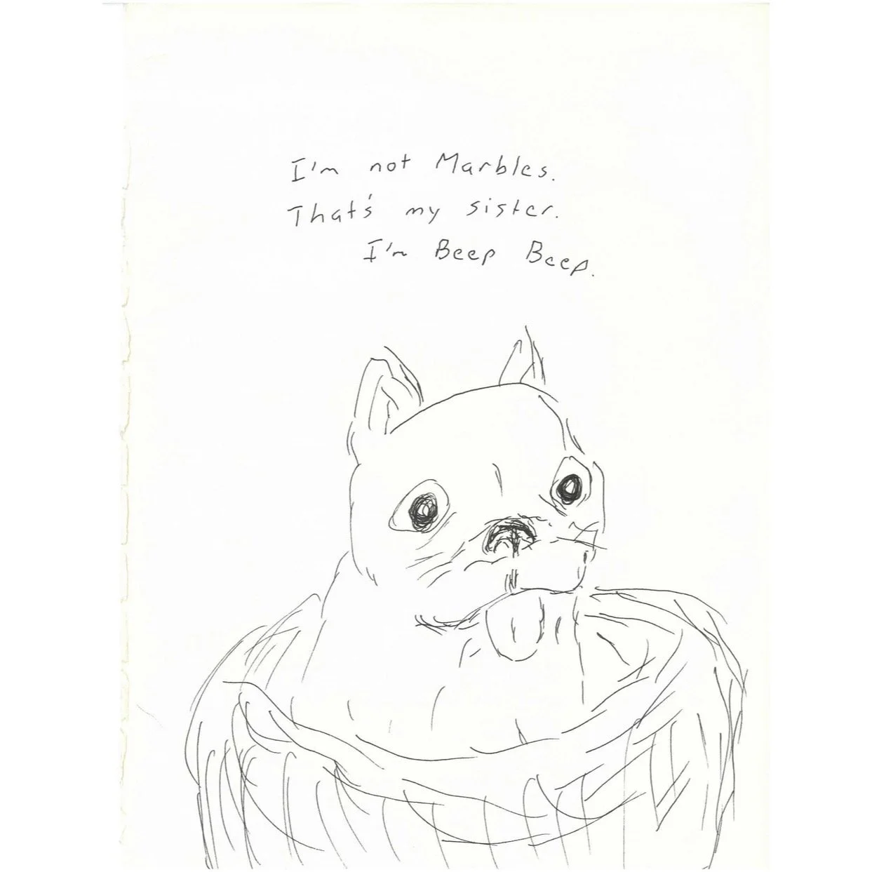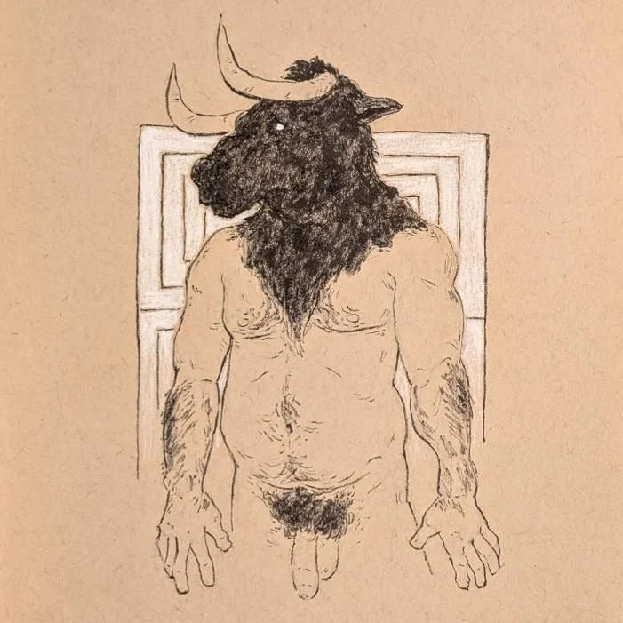 I wake up not knowing what story I’m in. I hear the patter of Marbles and Beep Beep—Marbles named for Raymond and Connie Marble, the villains of John Waters’s Pink Flamingos played by David Lochary and Mink Stole and Beep Beep for her namesake, Tama Janowitz’s dog in the 1980s—and drift back to myself. I must rise because my geriatric dogs need to be fed and watered and let out ceremonially. Likely they have already gone on the pee-pee pads dotting the house or more likely wherever their tiny, mischievous hearts and bladders please. Recently while organizing, I discovered the box of my juvenilia had been besoiled by my dearests. When I trained them to go on the paper I should have been more specific. I could scarcely be upset though. I’ve spent most of my adult life pissing on my childhood and upbringing. While the dogs eat, I situate myself by perusing the morning jumble of disasters and tidbits, then assess yesterday’s progress and damage. Three boxes unpacked, resorted, abandoned. My dears have had their ways with some drawings of minotaurs, centaurs, satyrs, mermen, and, most viciously, their own portraits.