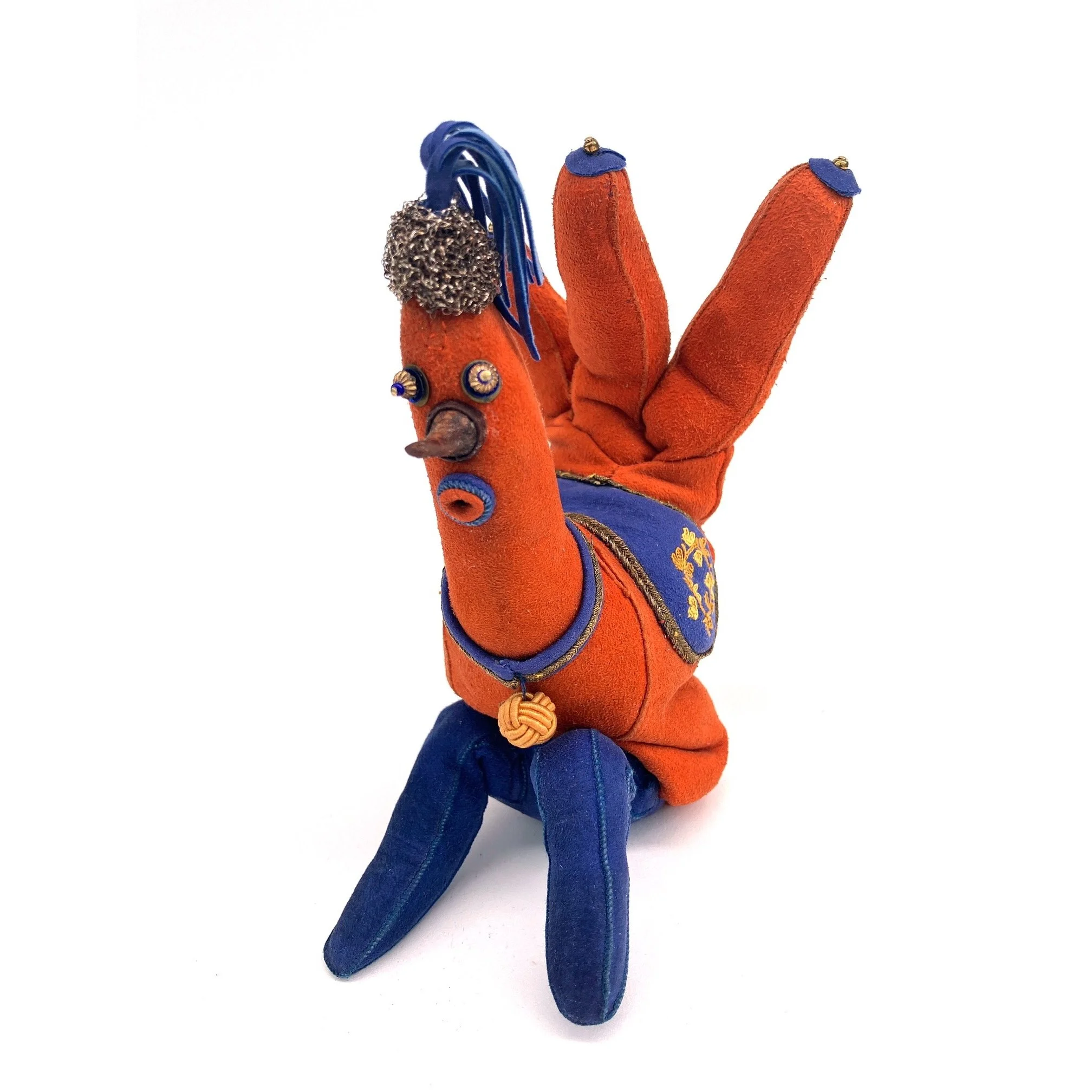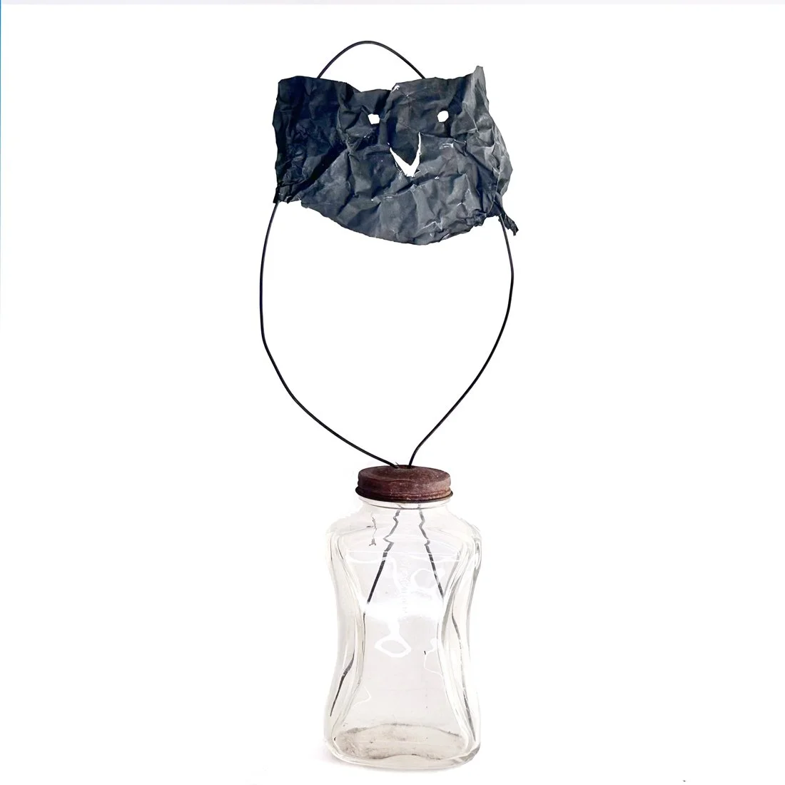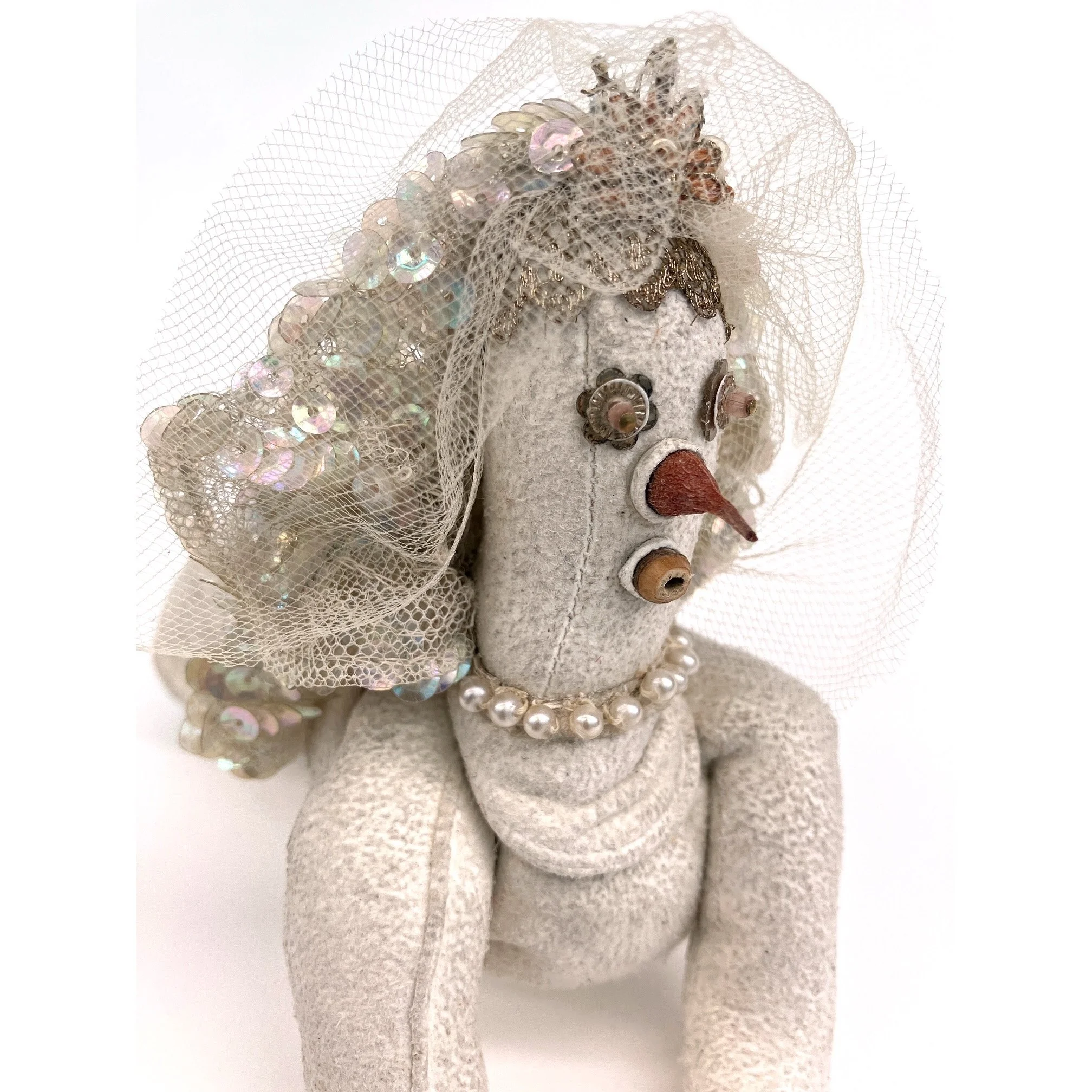 With Dolores, somatic trauma and feminine horror coalesce in kitsch. Inspired by the folk wisdom that hair holds memory, and by Catholic reliquaries and corporeal Victorian memento mori, I've cloaked a childhood Kewpie in my own hair, which I cut myself after a year shaped and shaded by grief. I wanted to express the strange and bittersweet facets of loss through a deeply weird aesthetic collision: Dolores' face is covered in a nod to traditional mourning veils, but her bell-shaped "dress" references the heavily lacquered, high-femme flips of the '60s. More so, a stylized pile of human hair with tiny hands — hands raised in welcome or warning? to grope or to plead? — is wholly unhinged, like some goofy, cult horror gross-out. Dolores is campy, unsettling, maybe even monstrous, but underneath, she is small, she is searching. She is sorrow.