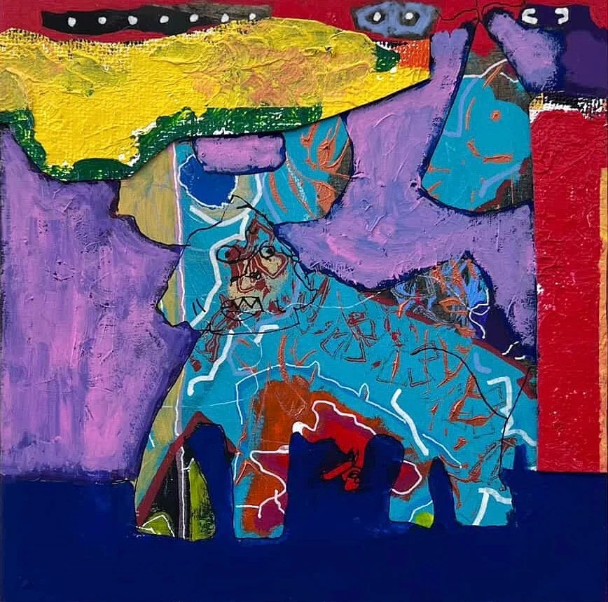 Oil, acrylic, Flashe, acrylic marker, gesso, and collaged burlap on wood panel